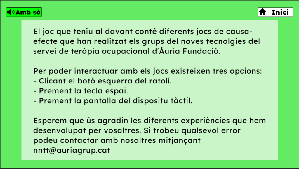 A partir de l’estudi anterior la idea principal del Programa de NNTT era realitzar un joc de causa efecte però gràcies a una reestructuració del programa vam començar a fer activitats d’atenció directa al servei de STO i d’aqui va sorgir la idea de que fossin els participants de l’activitat de NNTT els qui fessin el desenvolupament del joc de causa efecte i tancar el cercle, es a dir, segons les preferències de les persones del servei del CAE les persones del servei de STO els hi han fet un joc a mida. Durant diferents sessions vam apendre quin és el procés de creació d’un videojoc així com les diferents parts implicades en aquest procés per tant ens vam ficar a les bates dels dissenyadors i programadors. També vam aprendre les diferents tecnologies que intervenen en aquest procés creatiu com són els motors de joc, els programes de disseny 3D, edició d’audio, etc. Es va aprofitar per fer una petita introducció a la intel·ligència artificial generativa comentant les seves avantatge i les seves mancances, s’ha intentat evitar el seu ús en quasi tot procés creatiu amb l’objectiu de preservar els esforços dels participants l’hora de fer els seus dissenys i mantenir-ne l’essència, tot i això s’ha utilitzat de forma complementaria en un procés concret, en el quadern de treball podreu veure’l.