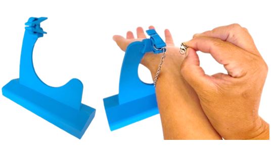 Estri pensat per facilitar l’acció de cordar polseres i similars de forma autònoma.